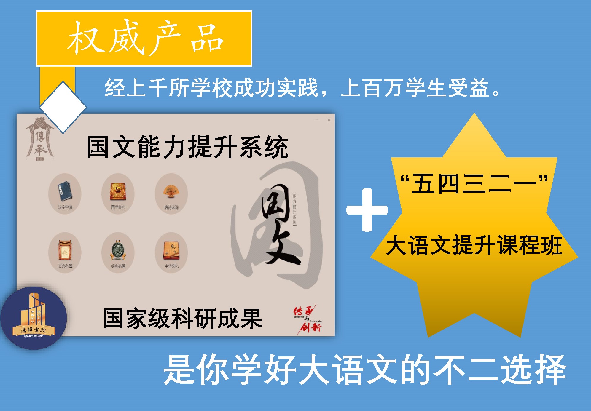 清铧学生大语文提升课程:根据全国十二五、十三五规划,北京大学联合清华大学、中国人民大学、北京师范大学等高校的教育专家完成的关于“中华优秀传统文化和当代语文能力研究”科研成果,五四三二一工程,经上千所学校成功实践,高效高分高能学大语文,从根部、从高处学习,从社会和家庭突破,借助传承国文能力提升系统,全方位快速提升语文综合能力,铸造优良品德。课程班包括:幼小衔接经典班、小学培根经典班、初中成才经典班。具体内容包括: